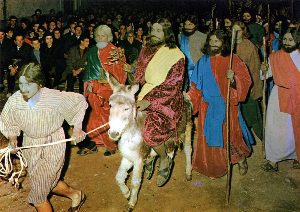 Palm Sunday Scene at the Main Square Performance. Moment when Jesus enters Jerusalem on a donkey, accompanied by the apostles, and is greeted by the crowd with cries of “Hosanna.”