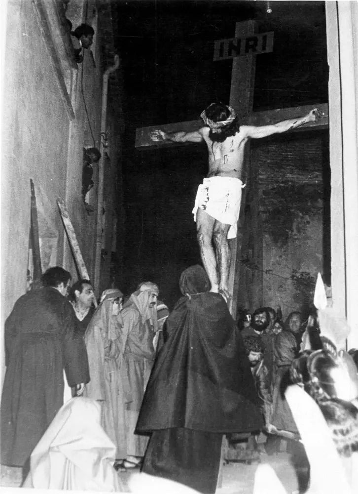 Image of the reintroduction of the Crucifixion and Descent from the Cross scene using live actors instead of the image of the Holy Christ. In the image, the group of Jews is seen crucifying Jesus while his mother pleads for mercy.