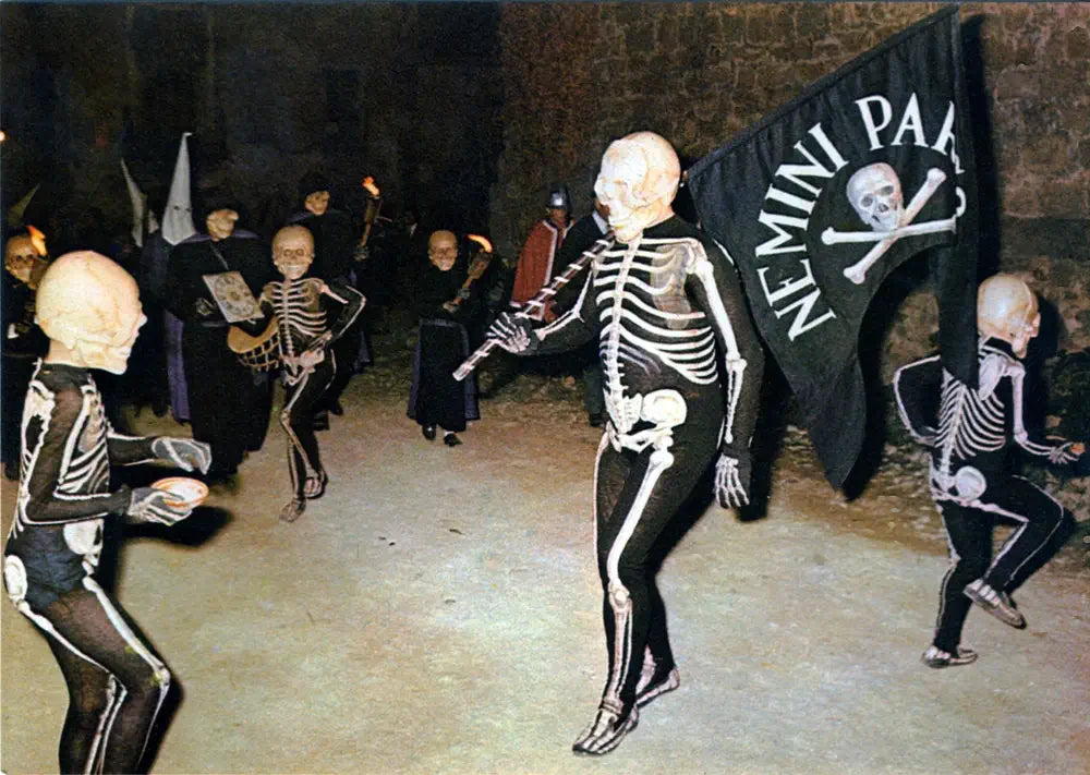 A part of the Dance of Death (the standard bearer, cymbals, and the hourglass) leaping beside the church to the sound of the drum and accompanied by torches. Also visible are one roman soldier with the old costume and several actors with lilac robes.