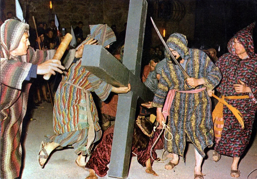 The Jews surround Jesus during one of his falls in the street representation. Holy Thursday night, Verges 1970.