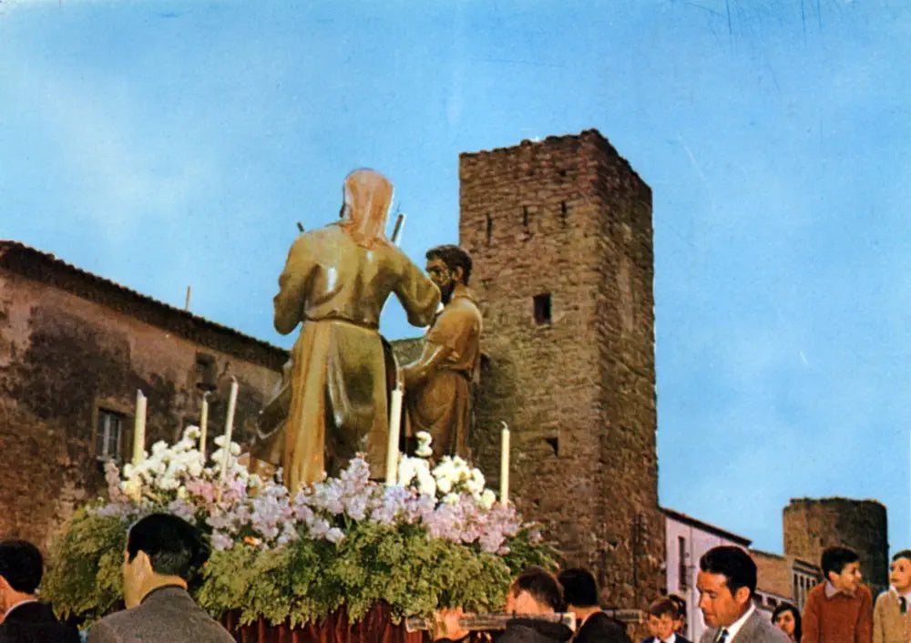 Imatge dels pas de l'Assotament, conegut popularment per 'Pistolets', al seu pas per la Plaça Major durant la recollida d'imatges de la tarda de Dijous Sant, Verges 1970.