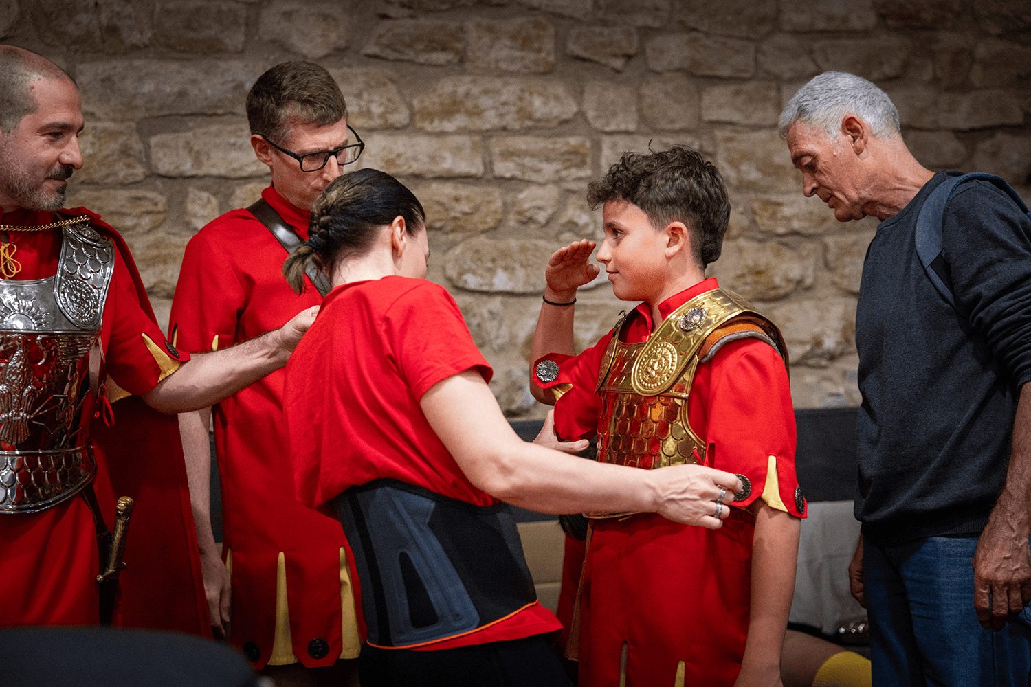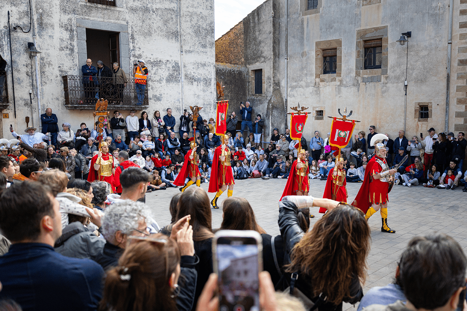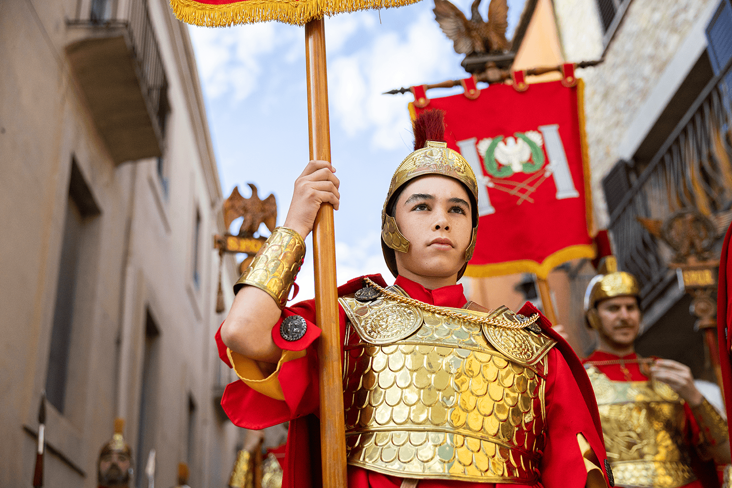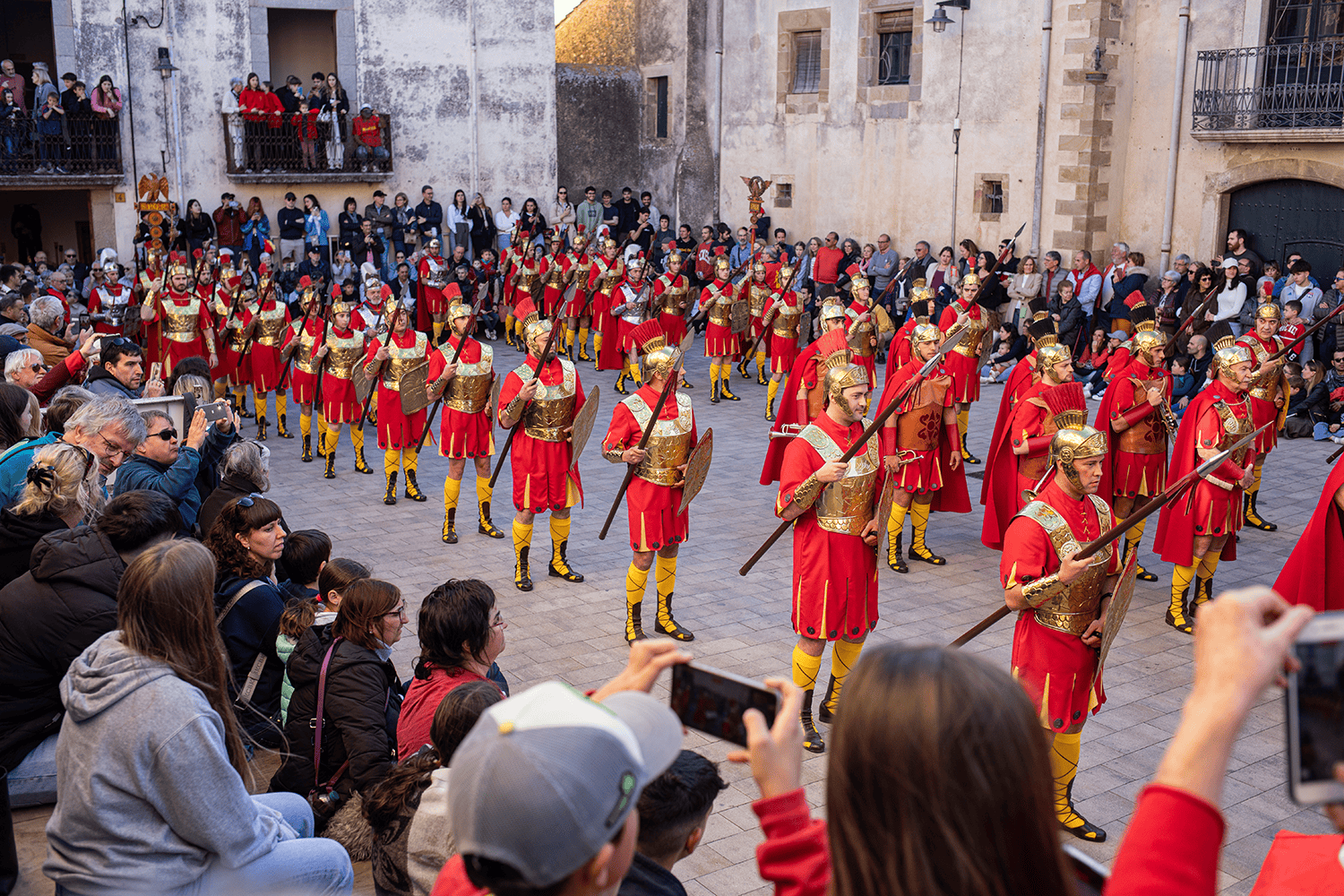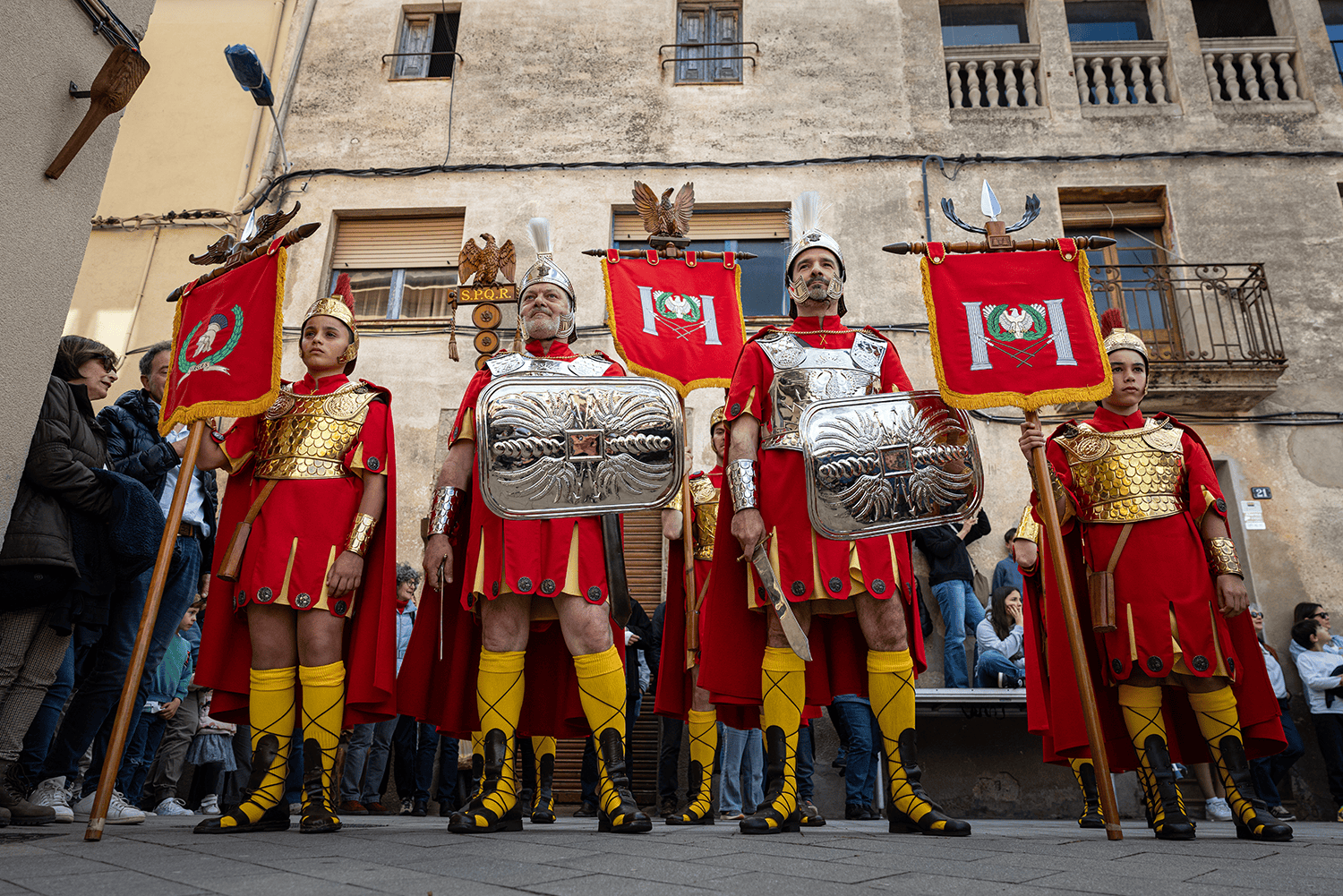 The Cadre of Manages - a cohort of armed Roman soldiers, who in Verges, exceptionally, are known by the feminine noun "manages" - is made up of 6 drummers, 2 bass drummers, 6 trumpeters, and 48 manages, with 6 captains, 2 small standard-bearers, 2 standard-bearers with the initials SPQR.