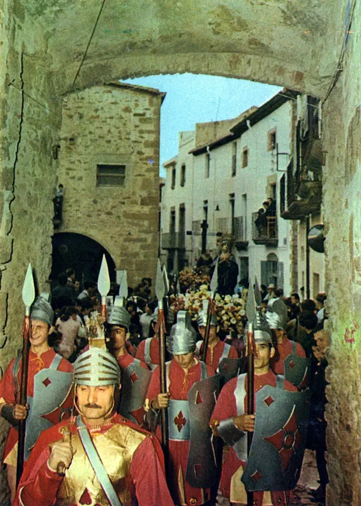 A group of manages marches along Carrer Major, just beneath the Portal of Our Lady, accompanied by the images they have retrieved of the Pietà and Our Lady of Sorrows.