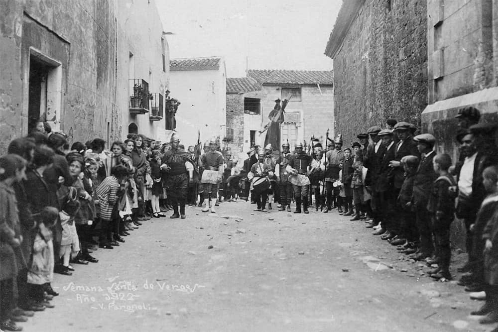 Manages going up Church Street with the image of the Nazarene. The musical formation accompanying the manages can be seen: flugelhorn, drum, and two manages with swords. Maundy Thursday, 1922.