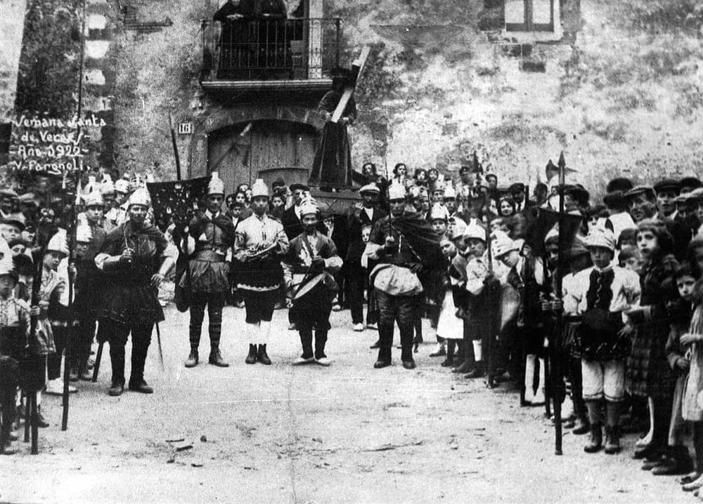 A group of manages, some of them children, collect the image of the Nazarene at La Placeta de l’1 d’Octubre. The formation accompanying the manages is clearly visible: a euphonium and a drum, a standard-bearer, and two manages with swords. Verges, Holy Thursday, 1922.