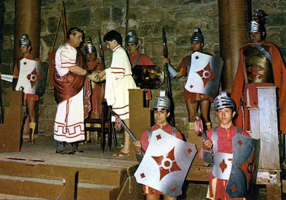 Pontius Pilate Scene. Depicts the moment when the Roman prefect Pontius Pilate, guarded by a large group of manages, washes his hands. Holy Thursday night, Verges 1970.