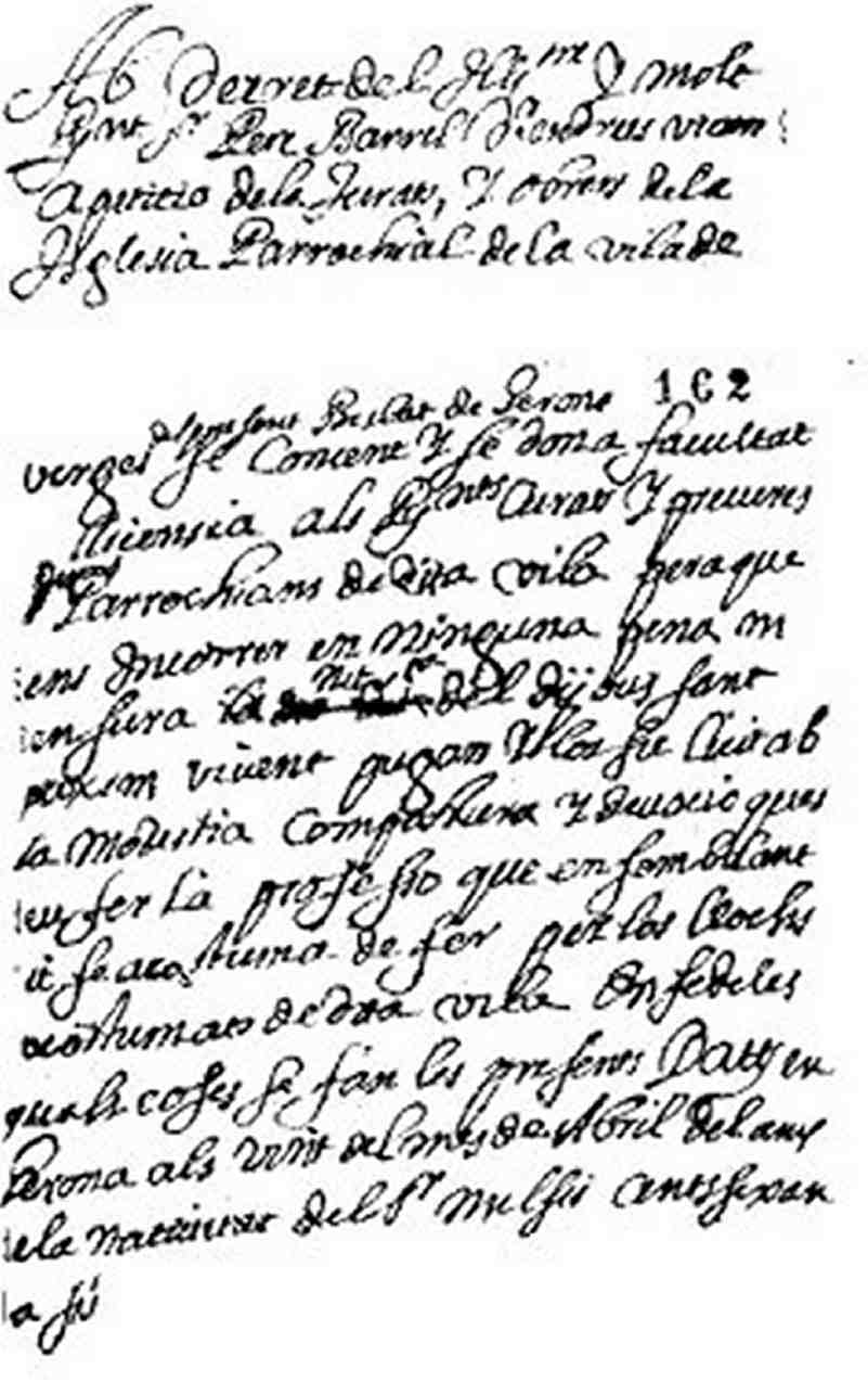 "Con decreto del ilustre y muy reverendo señor Pedro Barril, doctor en derechos, vicario general, a petición de los jurados, y obreros de la iglesia parrochial de la villa de Verges, del presente obispado de Gerona, se concentó y se da facultad y licencia a los reverendos curados y presbíteros y demás parrochianos de la noche del Jueves Santo próximo vengan y les sea lícito, con la modestia, compostura y devoción que debe, hacer la profesión que en semejante noche se acostumbra de hacer por los lugares acostumbrados de dicha villa, en fe de las cuales cosas se hacen las presentes en el seno del seno del mes de abril.
