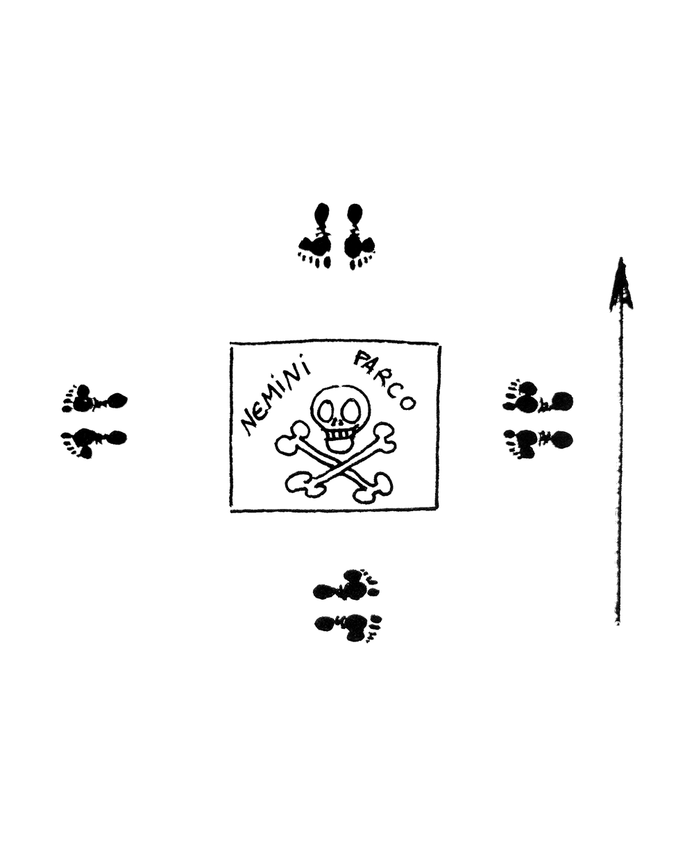 - La Bandera de fondo negro con la inscripción "Nemini Parco" y una calavera con dos tibias cruzadas. En algunos momentos también está la inscripción "Lo tiempo es breve" .