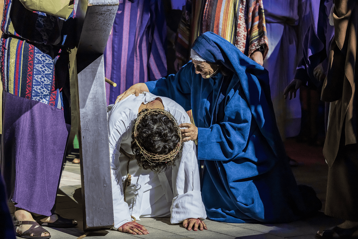 Després tenen lloc dues escenes més: la de les Tres Maries, quan la Mare de Déu, veient el seu fill tan maltractat, s’abraona cap a ell i hi manté un breu i emotiu diàleg; i la de la Verònica, que caritativament s’apropa a eixugar la cara de Jesús i la imatge del rostre del Messies queda gravada en el llenç que havia fet servir.
